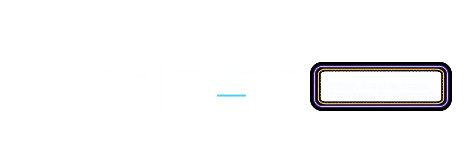 Foro: Cómo crecer con data en vez de plata Descubre el poder de los datos para la toma acertada de decisiones empresariales en un espacio de conocimiento y aprendizaje que hemos creado para ti Conoce cómo la analítica potencializa los resultados y cuáles han sido los retos más grandes que han enfrentado nuestros diferentes invitados. Mejorar la toma de decisiones. Mejorar el pronóstico de inventario para mejorar la disponibilidad de productos en los puntos de venta. Aumentar tus niveles de servicio. Acceder a una sorpresa única para los asistentes del evento, que les ayudará a empezar a transformar su negocio desde el primer día.